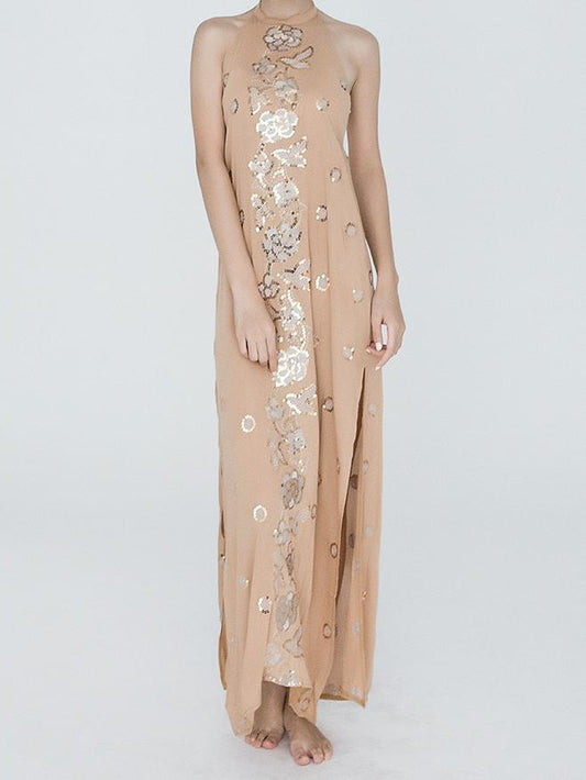 Bohemian style Sequin embroidered flowers hanging neck halter open the beach dress