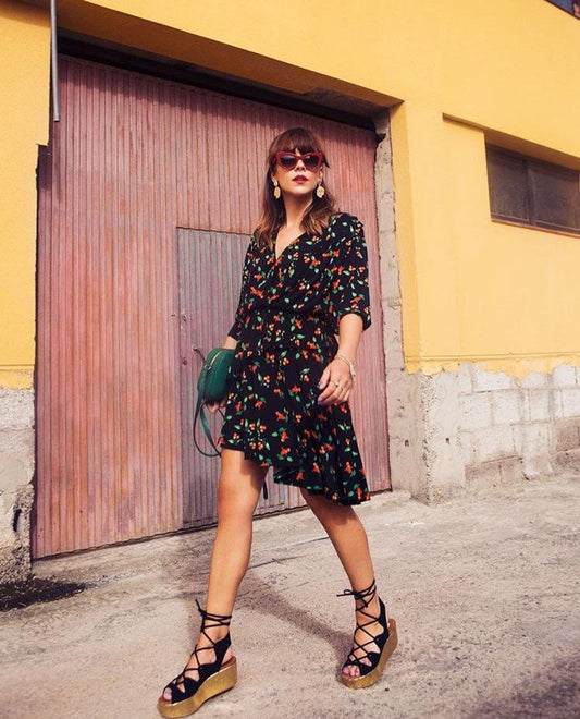 New short-sleeved printed beach skirt long skirt female cross V-neck short sleeve dress