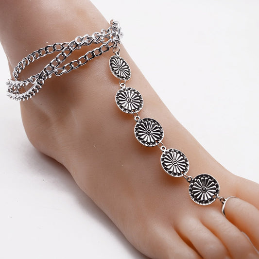 Vintage bohemian retro carved wafer three tassels toe socks toe chain foot