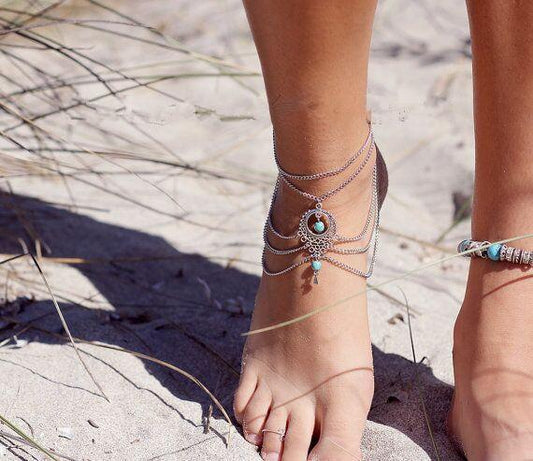 Vintage ethnic style hollow turquoise tassels drip multi-layer chain-link foot decorated woman