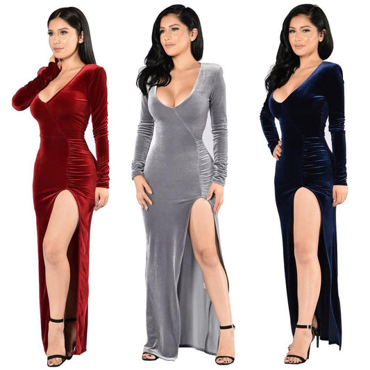 Plus size dress irregular personality solid color sexy long-sleeved deep V women s evening dress colored optional