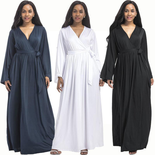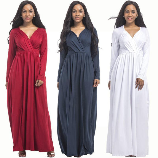 New plus size evening dress sexy big size deep V solid color long-sleeved dress