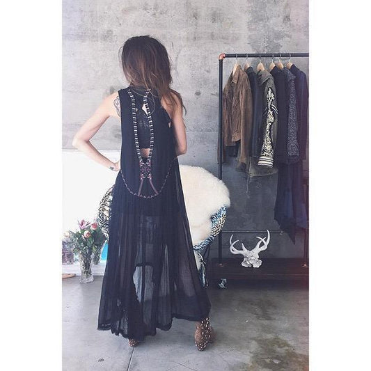 High quality hollow embroidery fringed waist ball strap full sleeve long Bohemia dress