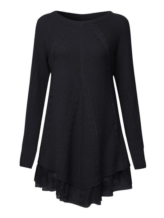 Women Long Sleeve Lace Stitching Pure Color Knitted Sweaters