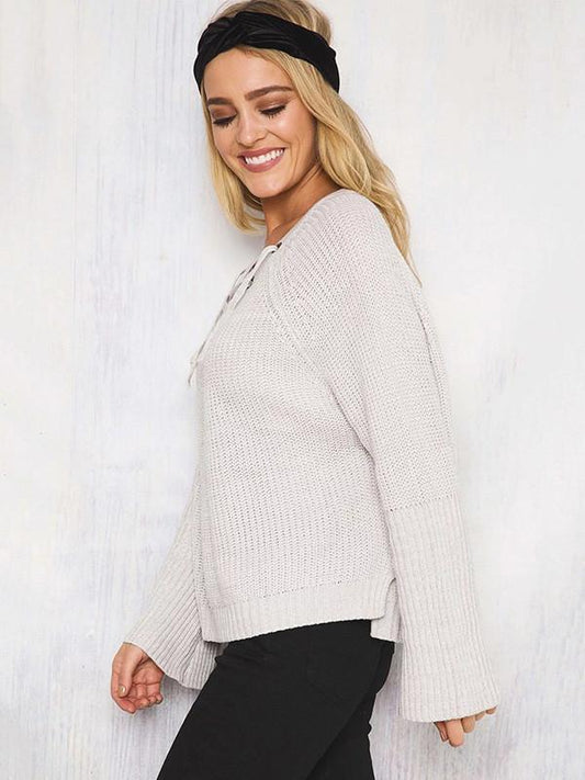 Asymmetric Solid Color V-neck Lace-Up Loose Sweater Tops