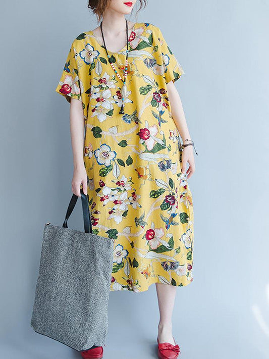 Gracila Floral Short Sleeve V Neck Pocket Loose Women Dresses