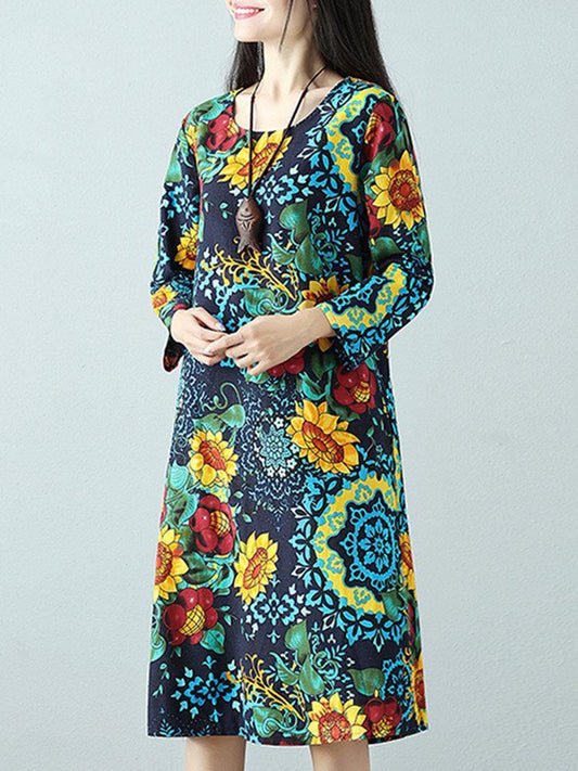Casual Printed O-Neck Long Sleeve A-Line Women Dresses