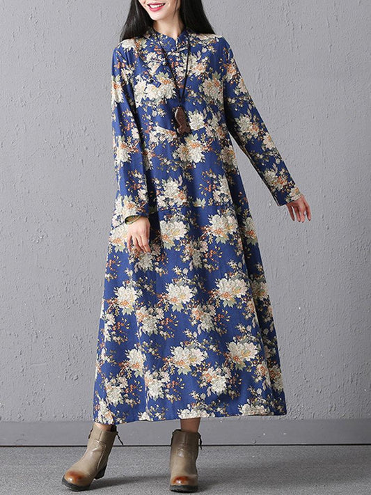 Casual Loose Floral Printed Stand Collar Women Dresses
