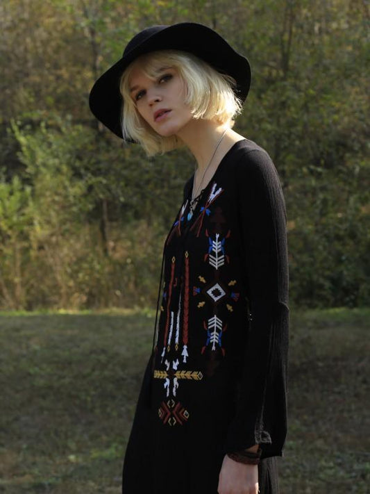 Bohemia Embroidery Long Sleeve Side Split Maxi Dress