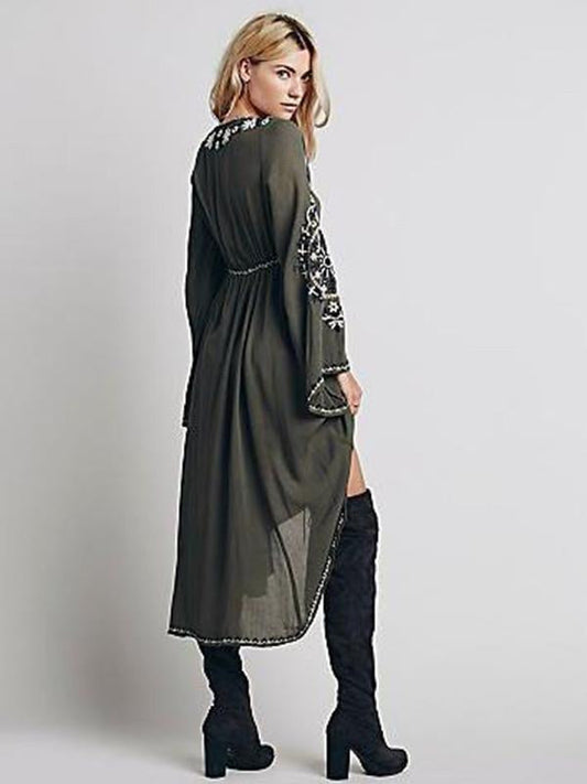 Bohemia Inwrought Floral-Print Long Sleeve Deep V Neck Maxi Dress