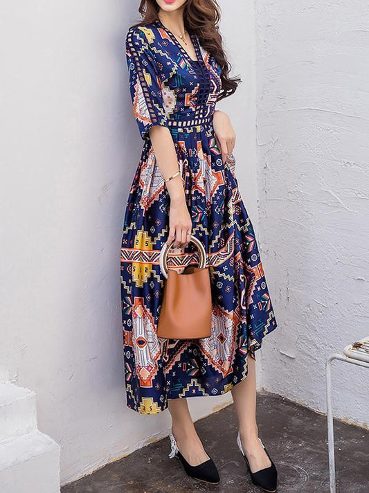 National Floral-Print Half Sleeve V Neck Bohemia Beach Dress
