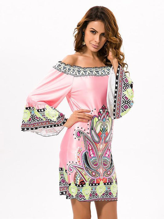 Pretty Floral Bohemia Off Shoulder Long Trumpet Sleeve Bodycon Mini Dress