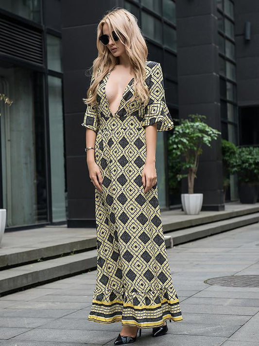 Fashion Popular Floral-Print Falbala Short Sleeve Deep V Neck Maxi Long Dress