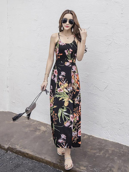 Floral Printed Spaghetti-neck Split-side Bohemia Maxi Dress
