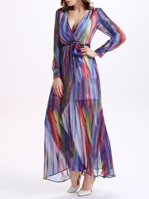 Beautiful Colorful Stripes Long Sleeve Deep V Neck Maxi Dress