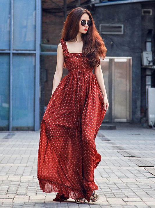 Retro Chiffon Printed Spaghetti-neck Backless Floor Maxi Dress