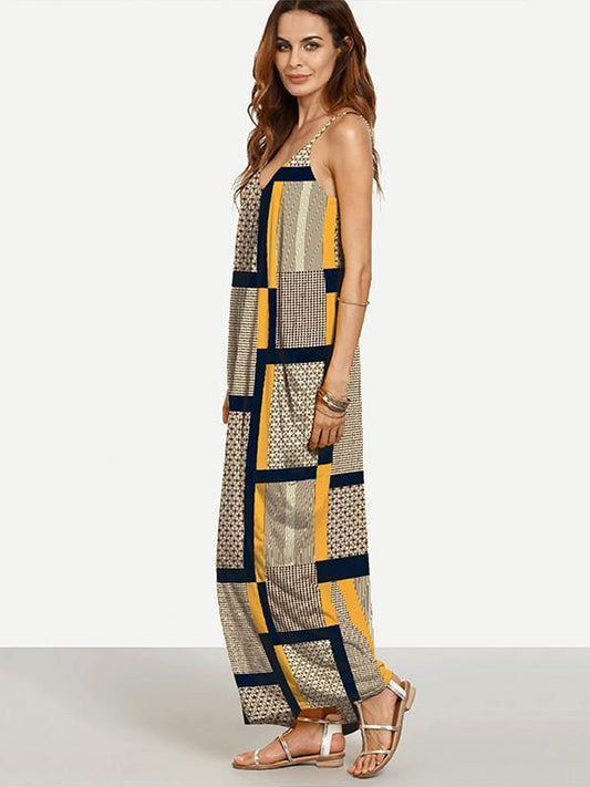 Unique Yellow Plaid Spaghetti Straps V Neck Maxi Dress