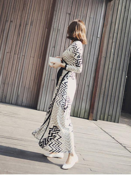 Classical Long Sleeve Deep V Neck Side Split Maxi Beach Dress