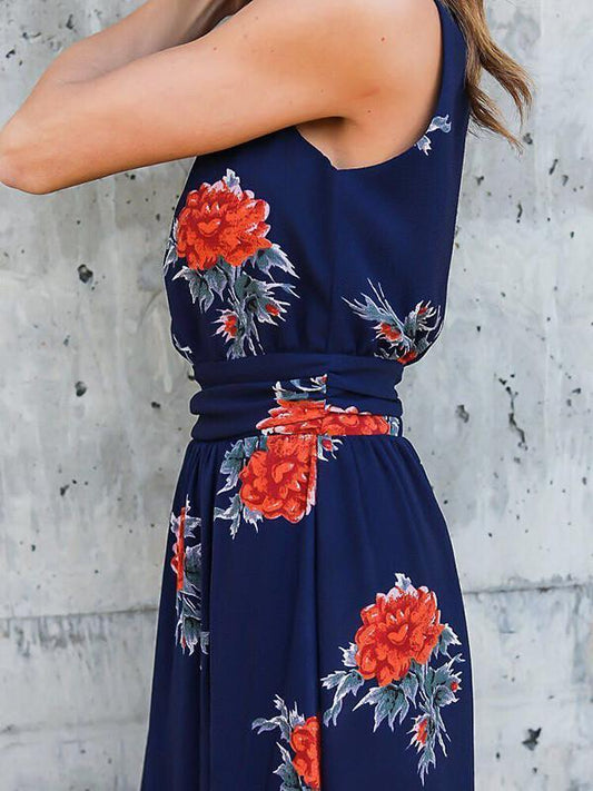 Popular Floral-Print Sleeveless V Neck Side Split Bohemia Beach Dress