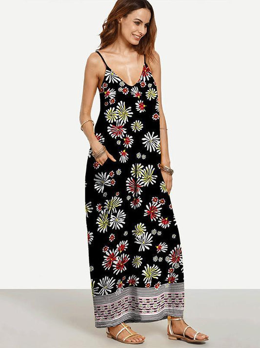 Pretty Black Floral Bohemia Spaghetti Straps V Neck Maxi Dress