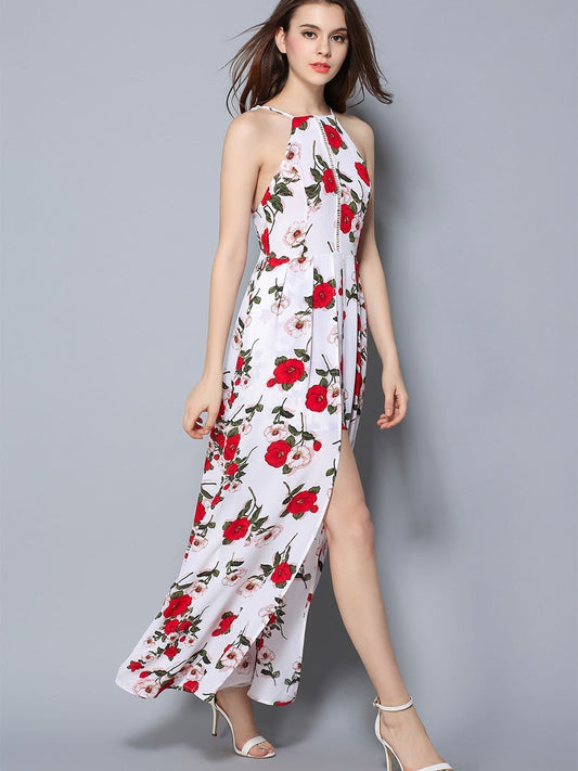 Halterneck Pleated Split-Front Floral Print Maxi Bohemian Dress
