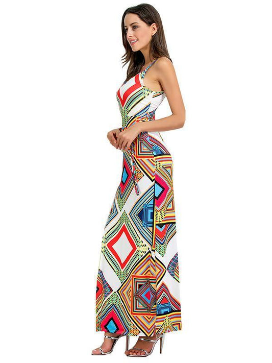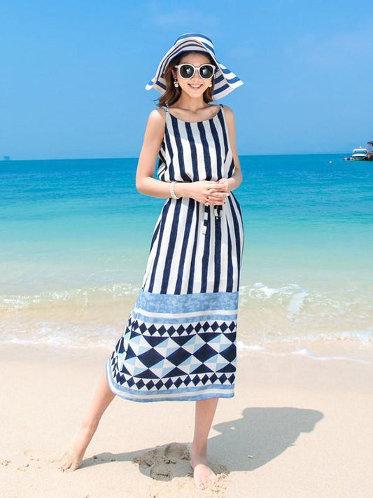 Popular Floral-Print Stripes Sleeveless Off-Back Side Split Beach Long Dress