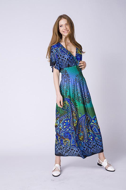 Bohemia Floral-Printed Short Sleeve V Neck Waisted Beach Long Dress