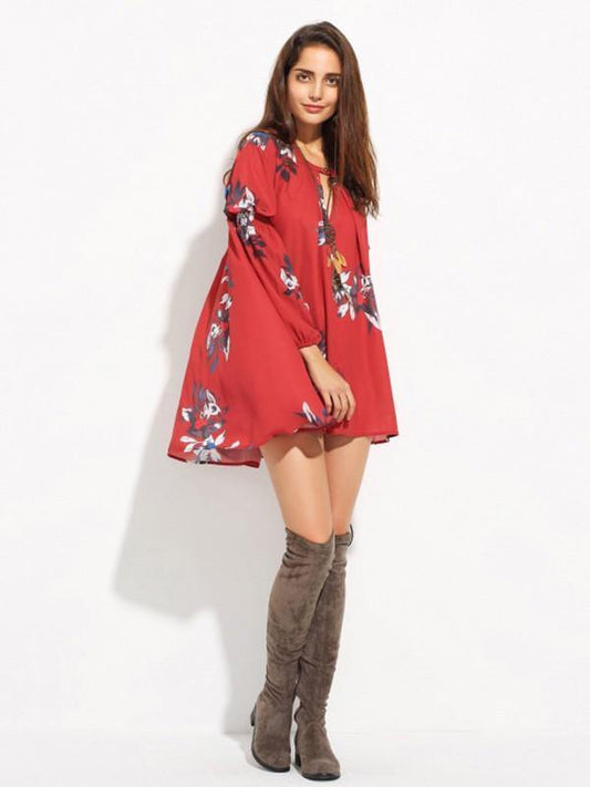 Chiffon Bohemia Floral Puff Sleeves V-neck Mini Dress