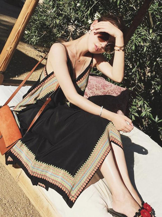 Attractive Black Bohemia Spaghetti Straps Deep V Neck Backless Beach Midi Dress