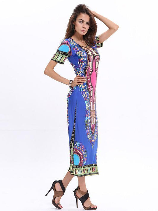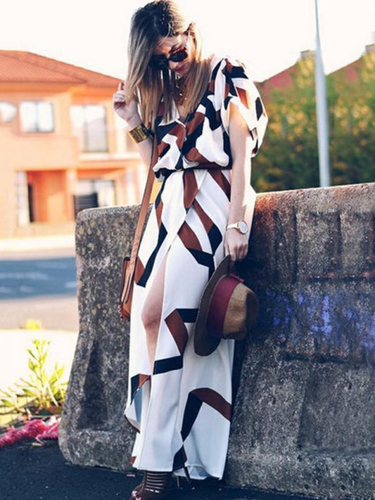 Fashion Printed Short Sleeves Deep V-neck Split-side Maxi Dress