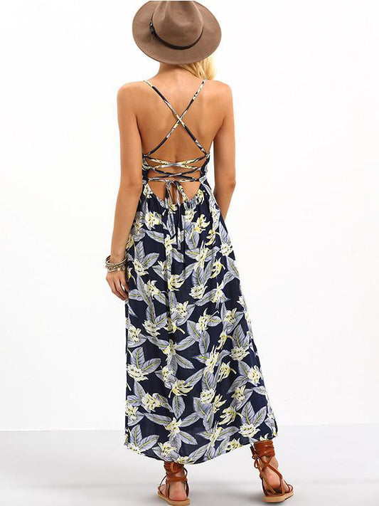 Pretty Floral Print Spaghetti-neck V-neck Maxi Dress
