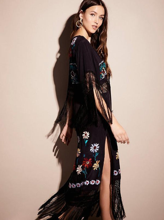 National Style Inwrought Floral-Print Deep V Neck Loose Bohemia Dress