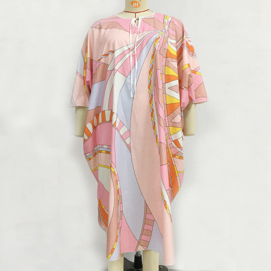 Bohemian Printed V-neck Buttons Three-quarter Sleeves Big Sleeve Dress Long Dress