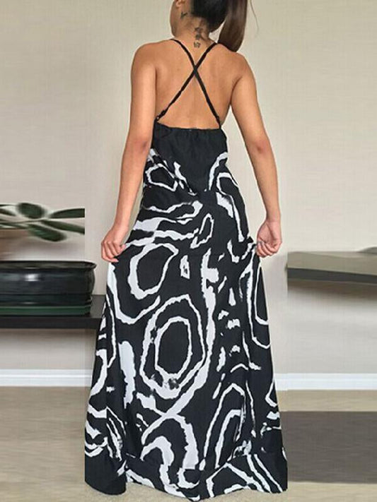Printed Spaghetti-neck V-neck Backless Cropped Maxi Dress