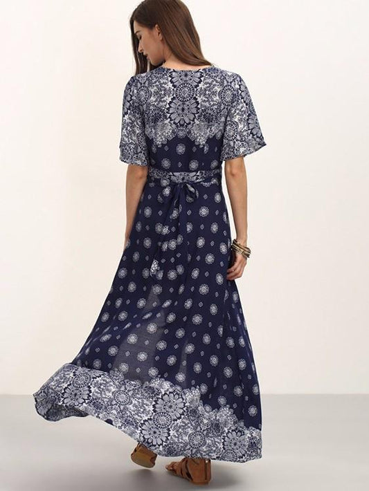 Bohemia Floral Side Split with Tie Short Sleeve Maxi Dress
