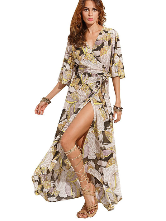 Sexy Chiffon Bohemia Floral Front Split with Tie Long Sleeve Maxi Dress