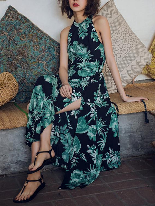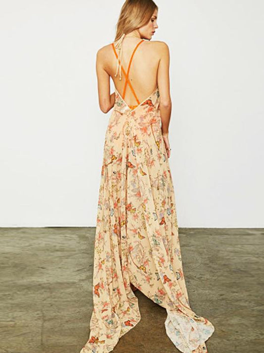 Summer Print Spaghetti Strap Irregular Beach Maxi Dress