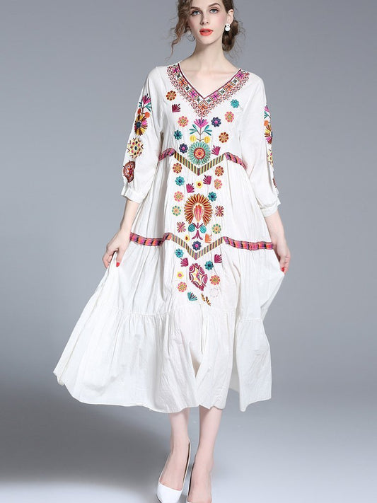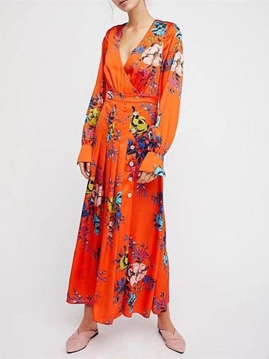 Mid Sleeve Floral Sexy V-neck Wide Hem Long Dress