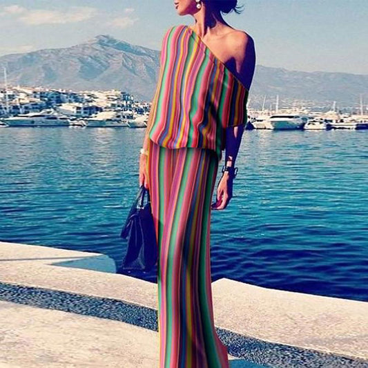 Large Size Off Shoulder Loose Rainbow Stripe Bohemian Dress