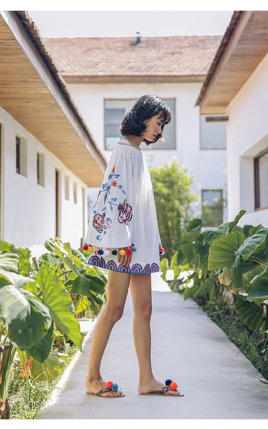 Pom Pom Off Shoulder Long Sleeve Embroidery Summer Mini Dress