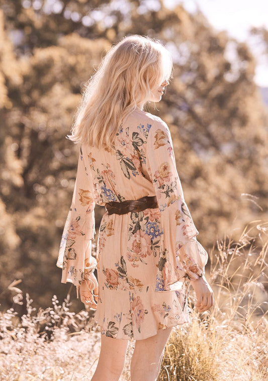 Vintage Floral Print Wrap Mini Dress V-Neck Long Sleeve Women Boho Dresses