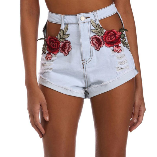 Floral Embroidery Ripped Denim Jeans Cut shorts