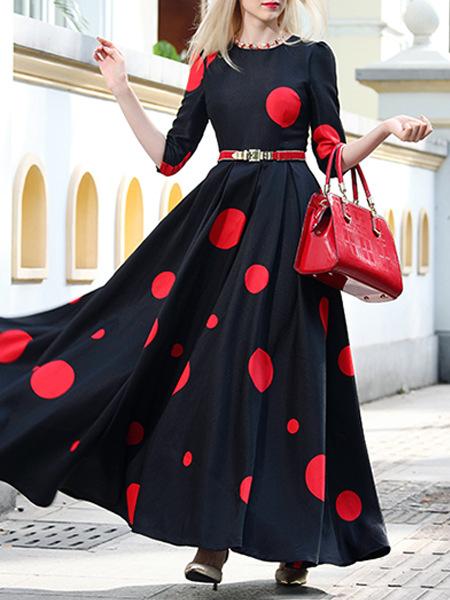 Vintage Polka Slim Big Hem Long Sleeve Maxi Dress