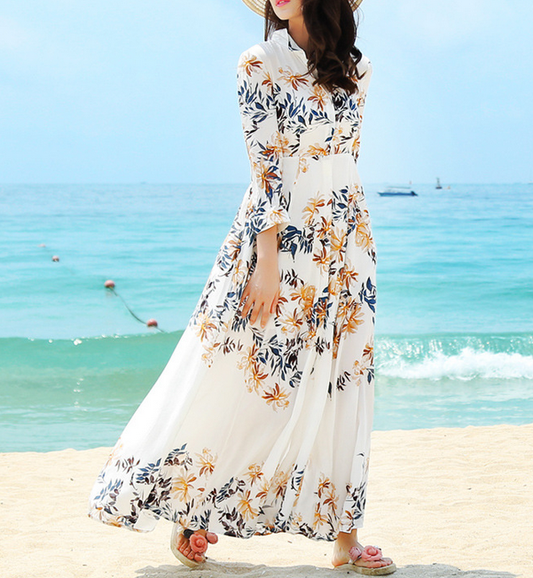 Leaf Print Bohemian Casual Long Sleeve Big hem Maxi Dress