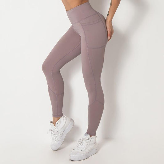Spliced pocket size double-sided nylon high elastic sports high waist hip tight yoga pants women.