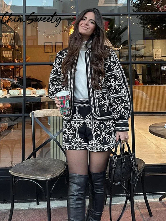 Street Print Coat Shorts Set Women Loose O-neck Lantern Cardigans Elastic Shorts Female Suit 2024 Autumn Fashion Y2k Lady Outfit