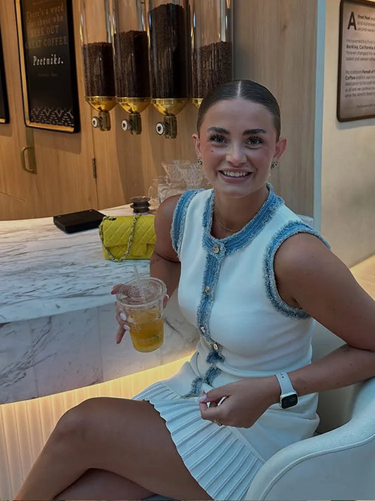 Women Elegant Denim Patchwork Single Breasted Mini Dress Fashion O Neck Sleeveless Single Breasted Vestido Chic Lady Street Wear