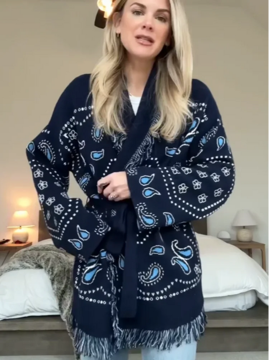 Tassel Patchwork Printed Cardigan Women Geometric Patterns Belts V-neck Long Sleeve Knitted Street Lady Sweater 2025 Autumn Coat
