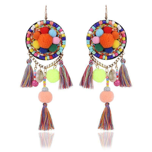 Ethnic Bohemia Dangle Pompom Shell Beads Silk Long Tassel Earrings