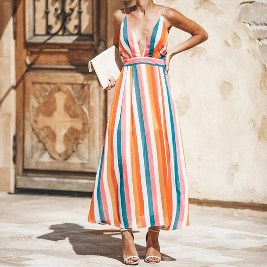 Colorful Striped Print V Neck Backless Sexy Long Dress